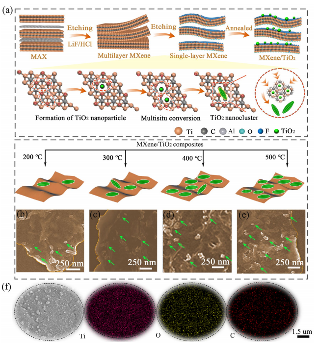 ‌結(jié)構(gòu)演變‌:圖1a展示了從MAX相到MXene再到TiO?雜化材料的逐步轉(zhuǎn)化過程,強調(diào)表面官能團在原子重構(gòu)中的作用。