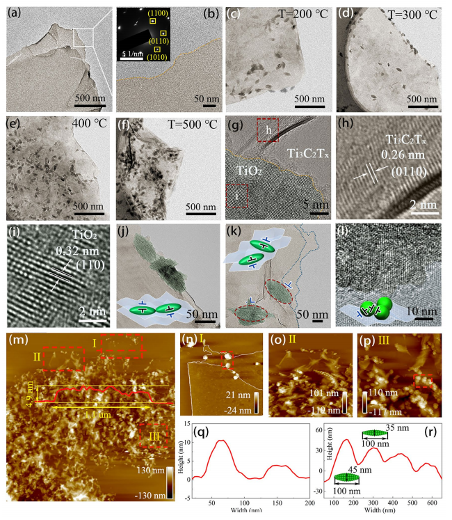 · ‌c-f‌:不同煅燒溫度下制備的MXene/TiO?雜化材料(MT-2至MT-5)的形貌,隨溫度升高(200–500°C),TiO?納米團簇的數(shù)量和尺寸逐漸增加。
