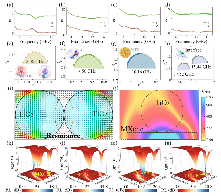 · ‌i,j‌:TiO?納米顆粒間及TiO?與MXene界面的電場分布模擬圖,顯示界面處電場不均勻性,證實界面極化效應(yīng)。