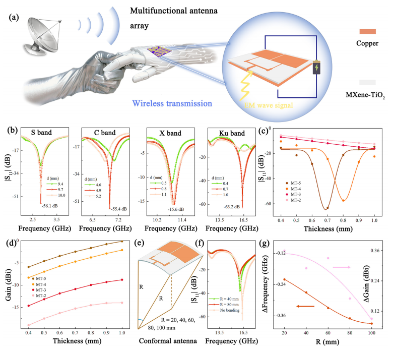 該天線陣列通過MXene/TiO?雜化材料的原位原子重構(gòu)工程,實現(xiàn)了電磁響應(yīng)定制化,兼具寬頻帶、高增益和機械柔性,適用于多頻譜隱身與智能蒙皮應(yīng)用。