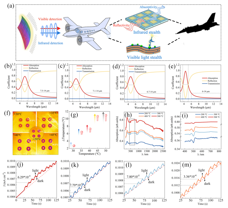 · ‌a‌:紅外隱身(3–5 μm和8–14 μm波段)與可見光隱身(380–780 nm)協(xié)同作用機制示意圖。