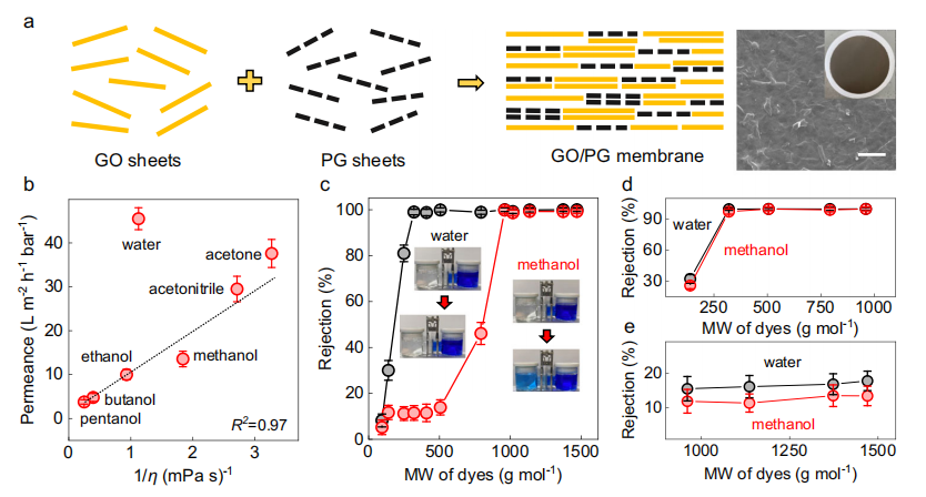圖2 | GO/PG膜溶劑滲透率與分子篩分的可逆切換性能‌‌