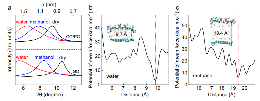 通過XRD與自由能計算,揭示溶劑極性調控GO/PG膜層間距的物理化學機制。