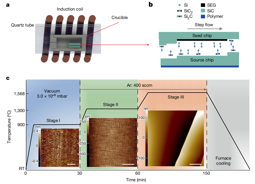 · 高溫效應:兩芯片間微小溫差(約10°C)引發質量流動,促使Si面形成大面積原子級平坦臺階,SEG薄膜在其上均勻生長。