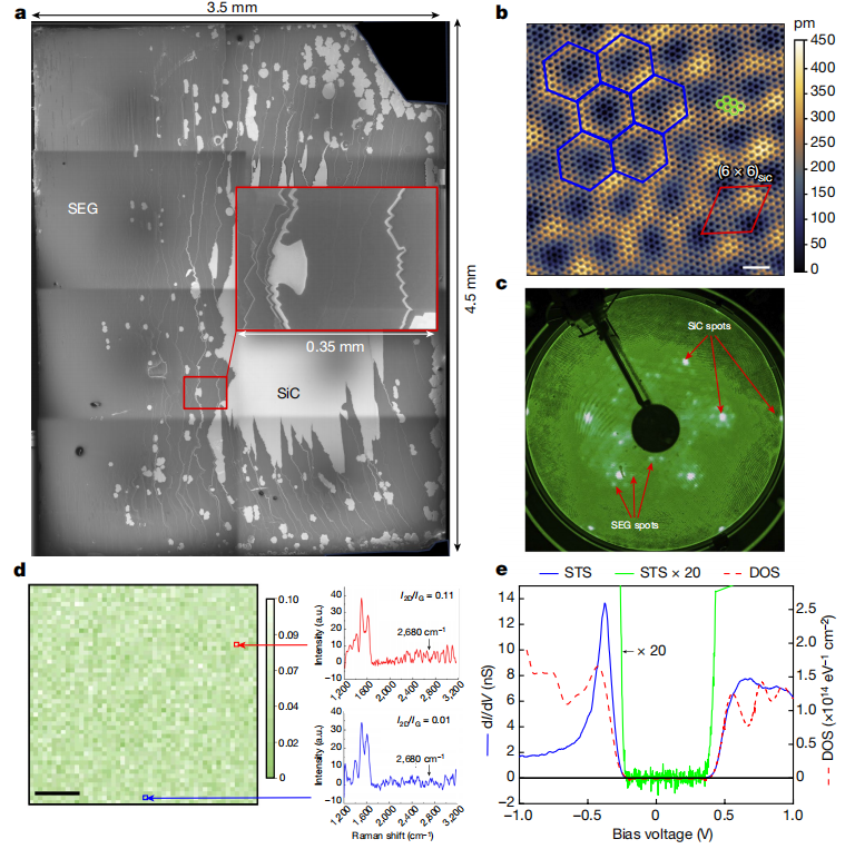 圖2展示了高覆蓋率、有序排列且無石墨烯混雜的半導體外延石墨烯(SEG)的表征結果,其具有明確的帶隙。