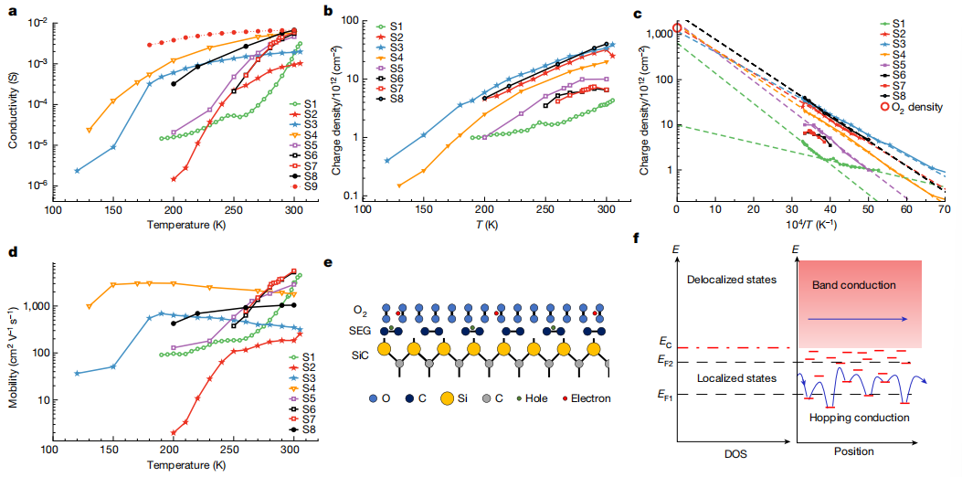 · 雙輸運模式:低溫局域態跳躍(低遷移率)與高溫能帶輸運(高遷移率)的轉變(圖f)。