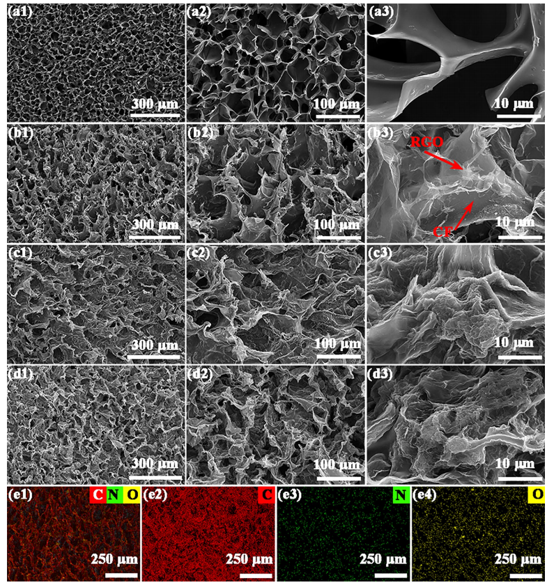 圖2.a1–d3) CFs(純碳泡沫)、R2/CF(2mg/mL RGO負載)、R4/CF(4mg/mL RGO負載)與R6/CF(6mg/mL RGO負載)的場發射掃描電子顯微鏡(FE-SEM)圖像