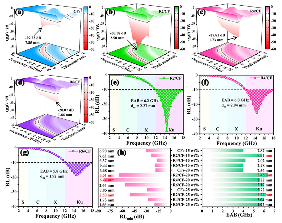 • 電磁性能:通過RGO含量與碳化溫度的雙重調控,首次實現阻抗匹配(RLmin=−50.58 dB)與介電損耗(EAB=6.2 GHz)的協同優化