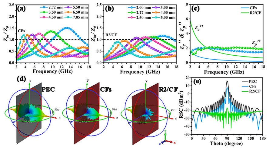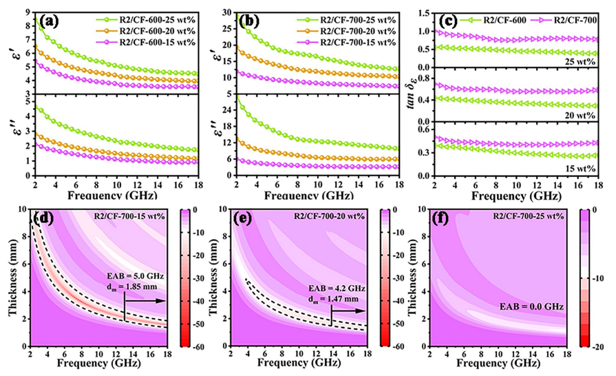· *‌圖e‌:通過對比CFs(碳纖維)與RGO/CFs(還原氧化石墨烯/碳纖維)的ε′/ε′′,凸顯RGO改性對介電性能的調控作用。