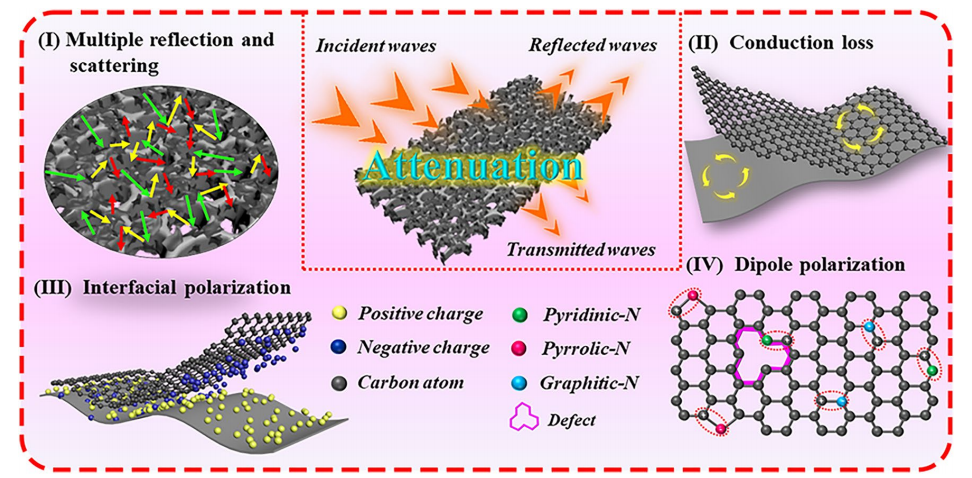 ‌4‌ ‌多重散射‌ 分級孔隙導電磁波漫反射 CFs支撐骨架+RGO褶皺 延長傳播路徑(RLmin強化)