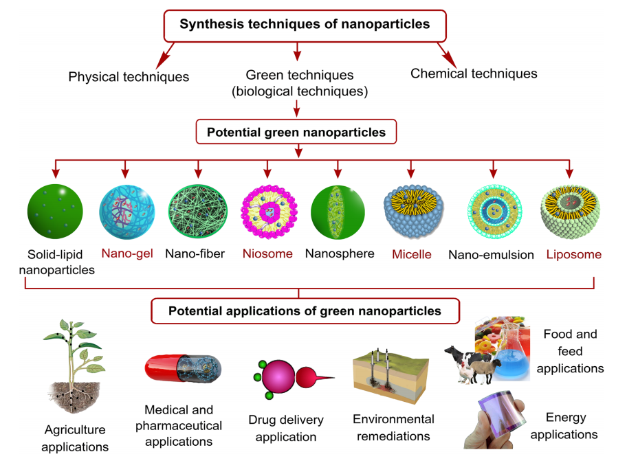 多種技術被用于合成納米顆粒,包括物理、化學和生物方法。綠色納米顆粒的來源可能包括植物提取物、生物體、酶、農業廢棄物以及超聲波和微波輔助合成。一系列綠色合成技術可生產出如脂質體、囊泡、納米乳和納米凝膠等納米顆粒。這些環保型納米顆粒在農業、生物醫學、環境、食品、飼料和能源等領域均有應用。