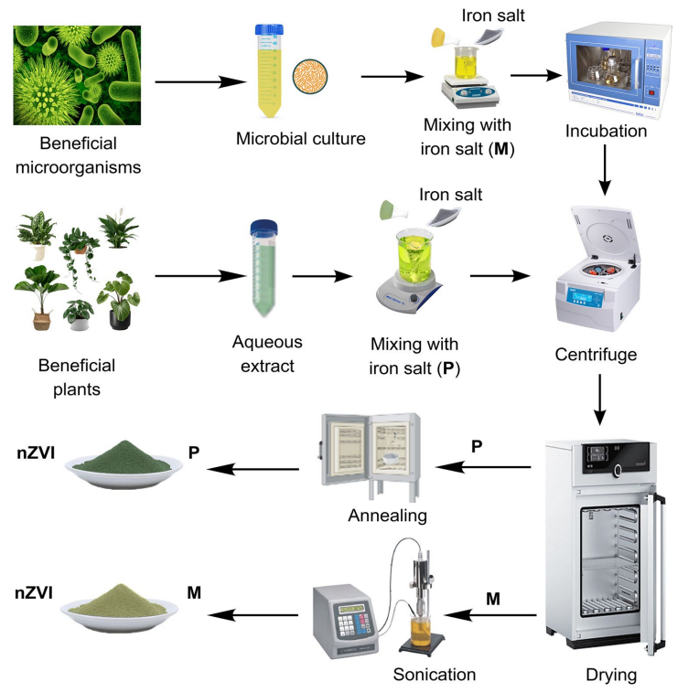 圖2 微生物(M)與植物(P)綠色合成納米零價鐵(nZVI)流程