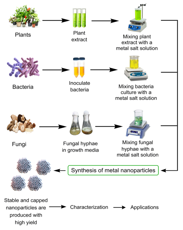 近年來,納米顆粒合成方法顯著轉向可持續和環境友好的途徑。傳統納米顆粒合成方法通常涉及危險化學品和高能耗過程,引發環境問題并產生有毒副產物。相比之下,綠色合成方法通過利用微生物、植物和農業廢棄物等生物基材料作為環保的納米顆粒合成來源,提供了可行的解決方案。多項研究表明,綠色合成方法能有效生產具有理想特性的納米顆粒。微生物介導的合成顯示出巨大潛力,因為微生物能夠還原金屬離子并形成納米顆粒。此外,真菌和藻類介導的合成已成為可持續和可規模化生產納米顆粒的替代方法。植物介導的合成因其豐富的物種多樣性和生物活性化合物而受到廣泛關注。植物各部分如葉、根和種子已被研究其還原金屬離子和促進納米顆粒形成的能力。此外,農工業生物廢棄物的增值利用開創了將農業殘留物和工業副產品轉化為生物納米吸附劑、生物納米催化劑和生物納米消毒劑的新方法。