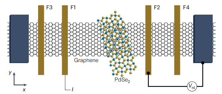 示意圖顯示單層石墨烯自旋通道(黑色蜂窩晶格)與五邊形結構PdSe2(藍黃原子結構)的界面,該界面誘導出各向異性自旋-軌道耦合(SOC)。器件包含四個鐵磁電極(F1–F4;棕色)和兩個普通金屬接觸電極(深藍色)。自旋極化電流I從F1注入,通過石墨烯擴散后在F2檢測,同時通過測量非局部電壓Vnl來探測自旋弛豫。該裝置可用于研究鄰近效應調控的石墨烯中柵壓可調的各向異性自旋動力學。(根據文獻5改編,Springer Nature Limited授權)。‌