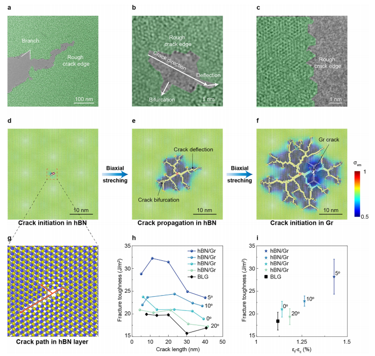 1、斷裂韌性提升:hBN形成粗糙裂紋邊緣,穩定裂紋擴展路徑,同步調控石墨烯斷裂發展,避免超晶格脆性分裂。