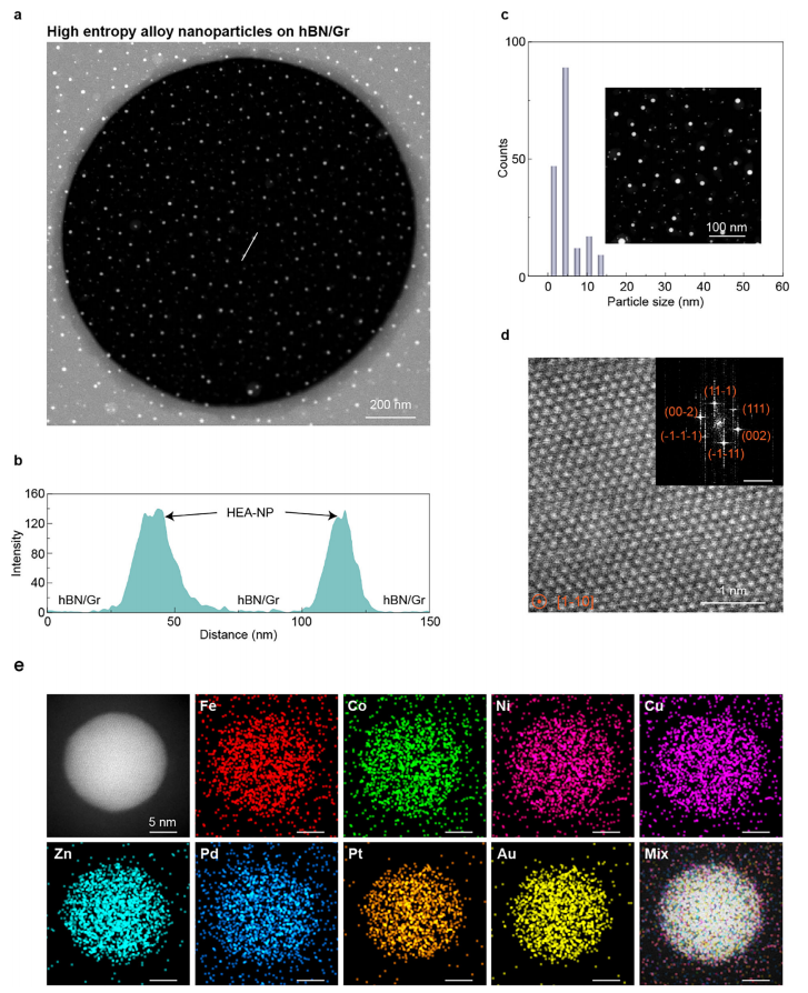 c) 合成HEA-NPs的粒徑分布統計。插圖:作為數據源的hBN/Gr上HEA-NPs的HAADF-STEM圖像(比例尺:100 nm)