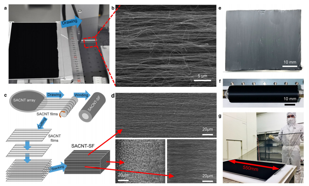 圖1. 超對齊碳納米管(SACNT)陣列、薄膜及堆疊薄膜。a) 從290毫米×140毫米石英基板上的SACNT陣列中拉制SACNT薄膜。b) 單層SACNT薄膜的掃描電子顯微鏡(SEM)圖像。c) 通過在棒上纏繞SACNT薄膜或?qū)⒍鄬覵ACNT薄膜堆疊在一起來制備超對齊碳納米管堆疊薄膜(SACNT-SF)的示意圖。d) SACNT-SF不同截面的SEM圖像,比例尺為20微米。e) 尺寸為40毫米×50毫米、厚度為2毫米的SACNT-SF。f) 在銅圓柱體上纏繞SACNT薄膜制成的SACNT-SF。g) 從SACNT陣列中拉制出550毫米寬的SACNT薄膜的照片。