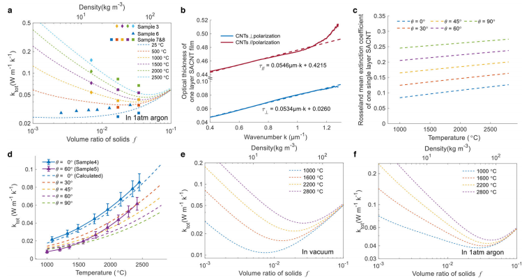 圖4. 提升SACNT-SF熱絕緣性能。a) 在1個大氣壓的氬氣環(huán)境中測量的SACNT-SF樣品總熱導(dǎo)率,相對于固體體積分?jǐn)?shù)f(或密度)在不同溫度下的變化。虛線代表計算值。b) 單層SACNT薄膜在近紅外波段對于兩種偏振狀態(tài)的光學(xué)厚度。c) 根據(jù)b)中的數(shù)據(jù)計算出的,相對于輻射偏振方向以不同角度排列的單層SACNT薄膜的羅斯蘭德平均消光系數(shù)。d) 在真空環(huán)境中,從1000°C到2600°C,SACNT-SF的熱導(dǎo)率。虛線代表計算值;實線表示實驗結(jié)果。e) 在真空環(huán)境中,SACNT-SF的熱導(dǎo)率作為f(或密度)的函數(shù)在不同溫度下的變化。f) 在1個大氣壓的氬氣環(huán)境中,SACNT-SF的熱導(dǎo)率作為f(或密度)的函數(shù)在不同溫度下的變化。