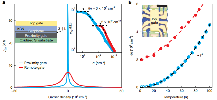 2、接近門控:在石墨烯附近放置石墨門,通過(guò)靜電屏蔽(proximity screening)顯著提高了石墨烯的電子質(zhì)量。