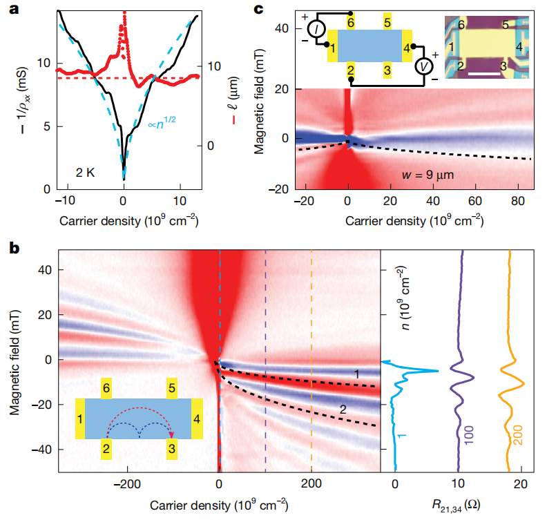 a,電導(dǎo)率和平均自由程(分別為黑色和紅色曲線)。藍(lán)色虛線表示由邊緣散射限制的輸運(yùn)所預(yù)期的n1/2依賴關(guān)系(最佳擬合得出?≈9µm)。紅色直線表示實(shí)際器件寬度約為8.5µm。