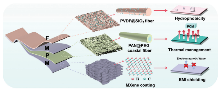 創(chuàng)新性地設(shè)計(jì)了多層復(fù)合結(jié)構(gòu)的PEG@PAN/MXene/PVDF@SiO2(PMF)復(fù)合薄膜,通過同軸靜電紡絲、噴涂和單軸靜電紡絲技術(shù),將相變材料(PEG)、導(dǎo)電材料(MXene)和疏水材料(PVDF@SiO2)有效結(jié)合,實(shí)現(xiàn)了材料的多功能化。