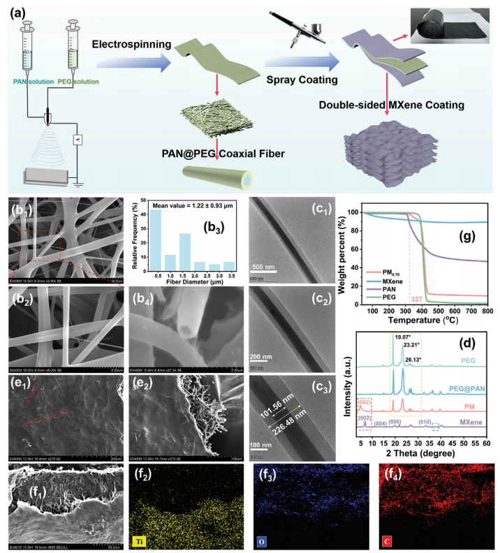 圖2. a) 展示PEG@PAN同軸纖維膜和PM復(fù)合膜制備過程的示意圖。b1-b2) PEG@PAN同軸纖維的掃描電子顯微鏡(SEM)圖像,b3) 直徑分布直方圖,b4) PEG@PAN同軸纖維橫截面的SEM圖像。c1-c3) 同軸纖維在不同放大倍數(shù)下的透射電子顯微鏡(TEM)圖像。d) PEG、PEG@PAN、PM和MXene的X射線衍射(XRD)圖譜。e1-e2) PM復(fù)合膜表面的SEM圖像。f1) PM復(fù)合膜橫截面的SEM圖像以及f2–f4) Ti、O、C元素的映射圖像。g) PAN、PEG、MXene和PM復(fù)合膜的熱重分析(TG)圖。