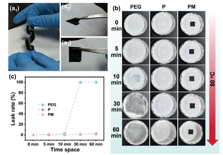 圖3. a1) 扭曲后的PM復(fù)合薄膜照片,a2) 呈飛機(jī)形狀的PM薄膜照片,以及a3) 恢復(fù)原狀的PM薄膜照片。b) 形狀穩(wěn)定性實(shí)驗(yàn)的數(shù)碼照片。c) 在80°C下,P薄膜、PM復(fù)合薄膜和純PEG在不同時(shí)間段的泄漏率。