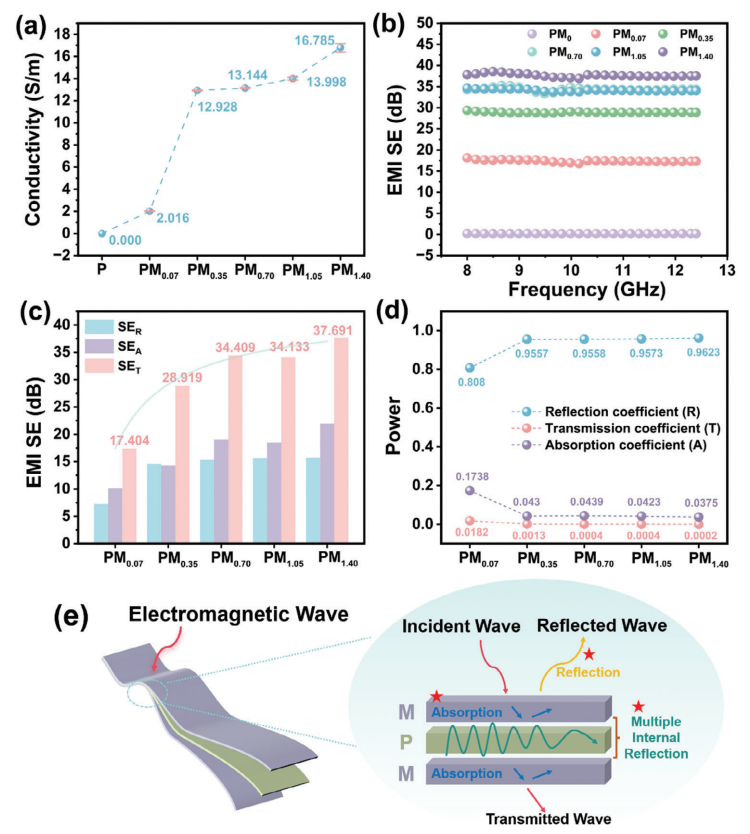 圖5. a) 不同MXene負(fù)載密度的PM復(fù)合薄膜的電導(dǎo)率,b) 電磁干擾屏蔽值,c) 平均EMI SE_T、SE_A和SE_R值,以及d) R、T和A系數(shù)。e) PM復(fù)合薄膜電磁干擾屏蔽機(jī)制的示意圖。