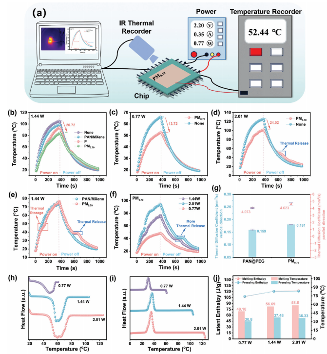 圖6. a) 電子芯片熱管理模擬實(shí)驗(yàn)的示意圖。b–d) 分別在1.44 W、0.77 W和2.01 W功率下加熱360秒時(shí),未覆蓋(None)和覆蓋PM0.70復(fù)合膜的模擬芯片的時(shí)間-溫度曲線(由插入的熱電偶溫度計(jì)監(jiān)測)。e) 在1.44 W功率下加熱360秒時(shí),PAN/MXene和PM0.70復(fù)合膜的時(shí)間-溫度曲線,以及f) 在0.77 W、1.44 W和2.01 W功率下加熱360秒時(shí),PM0.70復(fù)合膜的時(shí)間-溫度曲線(由紅外熱像儀記錄)。g) PEG@PAN膜和PM0.70膜在垂直和平行方向上的熱擴(kuò)散系數(shù)。h,i) 使用不同測試條件時(shí)PM0.70膜的DSC測試曲線,以及j) 相變溫度和相變焓。