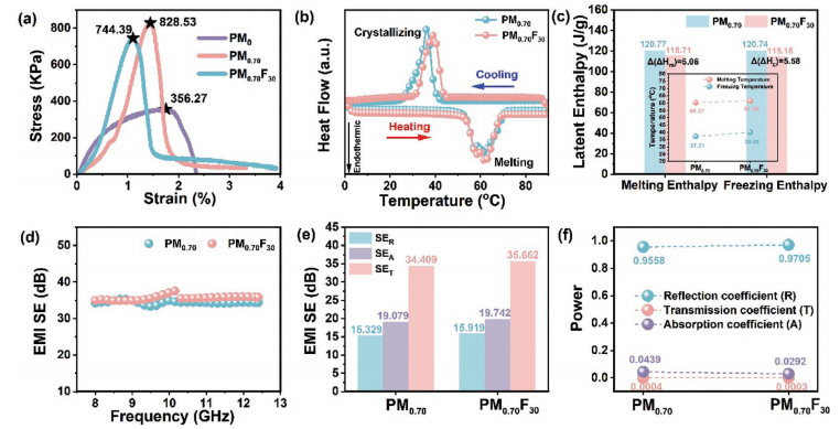 圖8展示了PM0、PM0.70和PM0.70F30三種復(fù)合薄膜在不同測試條件下的性能表現(xiàn)。這些測試包括力學(xué)性能測試(應(yīng)力-應(yīng)變曲線)、熱性能測試(DSC測試曲線、熔化和凝固焓及相變溫度)以及電磁干擾(EMI)屏蔽性能測試(EMI屏蔽值、平均EMI SET、SEA和SER值,以及R、T和A系數(shù))。