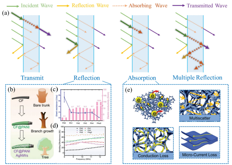圖2. a) 電磁波(EMW)在電磁干擾(EMI)屏蔽材料中的傳播模型。b) 分支-主干互鎖結構的示意圖。c) 碳纖維@聚苯胺/銀納米線復合材料的方塊電阻、相應電導率以及d) 電磁干擾屏蔽性能。[26] e) 負載PEDOT:PSS的蜜胺泡沫的電磁波吸收機制示意圖。[30]