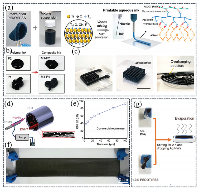 圖3. a) 展示了用于擠出打印的MXene功能化PEDOT:PSS墨水的制備示意圖。b) 原始PEDOT:PSS墨水和MXene功能化PEDOT:PSS墨水的照片。c) 打印結構的照片(a-c)。[39] d) 通過掃描離心鑄造法合成過程的示意圖。e) 石墨烯薄膜在10 GHz頻率下電磁干擾屏蔽效能(EMI SE)隨厚度的變化。f) 石墨烯薄膜的數碼照片(d-f)。[40] g) PVA/PEDOT:PSS/Ag NWs薄膜的制備示意圖。[43]