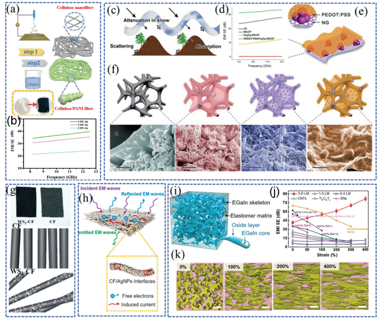 圖4. a) 纖維素納米纖維及纖維素納米纖維包裹綠色聚苯胺(PANI)球的制備示意圖。b) 纖維素納米纖維包裹PANI的電磁干擾(EMI)屏蔽效能(a, b)。[44] c) 天然電磁干擾屏蔽區域的示意圖。d) 不同導電層碳/聚氨酯的EMI屏蔽效能。f) CP、NG/CP、Fe3O4-NG/CP、PEDOT:PSS/Fe3O4-NG/CP的示意圖模型及放大后的掃描電子顯微鏡(SEM)圖像(c–f)。[47] g) 碳纖維(CF)和二硫化鎢修飾碳纖維(WS2-CF)的光學圖像及模型示意圖。[48] h) CF@AgNPs電磁干擾屏蔽機制的示意圖。[49] i) 三維液態金屬復合材料的示意圖。j) 在2.65–5.95 GHz和8.2–40 GHz頻率范圍內,復合材料的平均EMI屏蔽效能與應變的關系。k) 在0%、100%、200%和400%應變下,通過微X射線斷層掃描重建的三維形態(i–k)。[50]