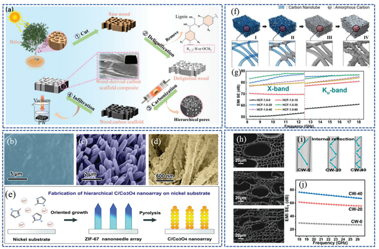 圖6. a) 木炭骨架/石蠟復合材料的制備示意圖。[62] b) 鎳基底的掃描電子顯微鏡(SEM)圖像,c) ZIF-67納米針陣列,以及d) 分層C/Co3O4納米陣列。e) 在鎳基底上制備分層C/Co3O4納米陣列的工藝示意圖(b–e)。[63] f) 孔隙結構調整過程的示意圖。g) 分層碳納米管(CNT)泡沫在8–18 GHz頻段內的電磁干擾(EMI)屏蔽效能(f,g)。[64] h) 不同壓縮比下碳化木的SEM圖像及i) 電磁波(EMW)傳播路徑。j) 不同孔隙結構的碳化木的EMI屏蔽效能(h–j)。[65]