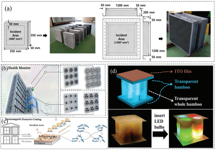 圖7. a) CNT/混凝土電磁干擾(EMI)屏蔽復合材料的幾何尺寸和光學照片。[80] b) 用于建筑物不同部位健康監測的應變傳感陣列模型。c) 窗戶上的透光屏蔽涂層(b,c)。[81] d) 由半透明全竹、透明竹和ITO薄膜組成的多層裝置,安裝有LED燈。[82]