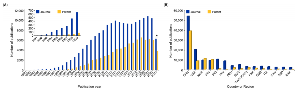 圖2:(A)1991年至2023年碳納米管相關(guān)研究的總體發(fā)表趨勢。(B)2003年至2023年碳納米管相關(guān)研究的領(lǐng)先國家或地區(qū)。數(shù)據(jù)來源于CAS內(nèi)容集的期刊與專利出版物。*注:2023年數(shù)據(jù)為局部數(shù)據(jù),僅包含1月至7月。