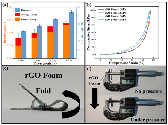 (a) 不同壓力下制備的rGO泡沫的肖氏硬度與密度;