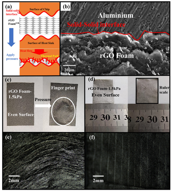 此圖的核心目標是**生動且多尺度地證明**rGO泡沫作為熱界面材料所具備的**卓越界面貼合能力**,這是實現低接觸熱阻的關鍵。
