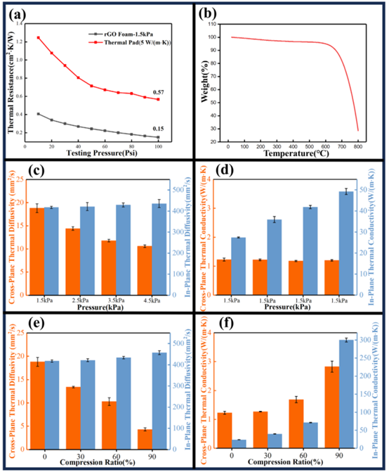 (d, e) 與 (g, h) 掃描電鏡圖像:(d, e) 展示了原始GO薄膜的截面形貌,呈現出致密、層狀堆疊的結構。而 (g, h) 展示了rGO泡沫的截面形貌,清晰顯示了高度多孔、三維互聯的網絡結構。這兩組圖的直接對比, visually confirms 了發泡工藝成功地將致密薄膜轉變為多孔泡沫,這是實現高壓縮性和低熱阻的關鍵微觀結構。