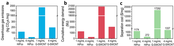 初始濃度從1 mg/mL提升至4 mg/mL,HiPco-SWCNTs的溫室氣體排放和累積能源需求降低80%,G-SWCNTs降低90%。
