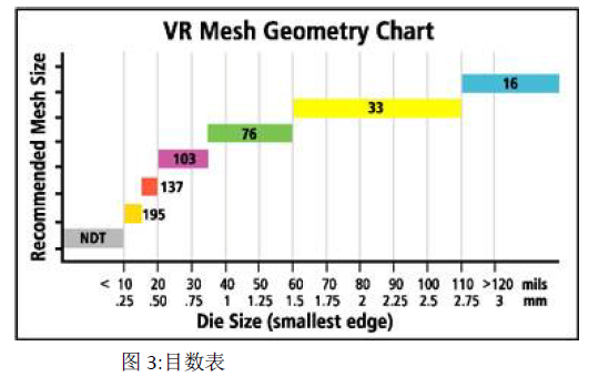 用于特定設備中正確的目數結構(也稱為目數大小)基于設備X、Y尺寸。對于最佳設備卸載性能,目的是減少膠到設備接觸點的數量,當VR托盤在釋放模式下(圖2)。因此,我司提供了一系列不同的目數結構:16,33,76,103,137,195。(圖3),每一個目數尺寸的對應線 the number of thread lines per linear inch。