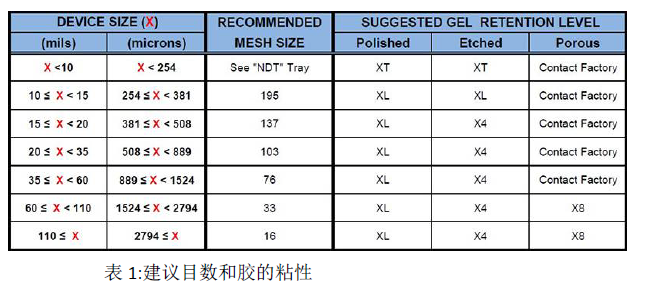 因為接觸點越少相當于膠吸附力越小,所以選擇目數結構時,目標是在釋放模式下,在保持設備完全支持的情況下,盡可能使用印刷線最少的目數。對于既定的設備尺寸,如果目數接觸點的數量不足,當真空應用于托盤時,將導致設備傾斜,從而可能導致卸載(誤選)問題。
