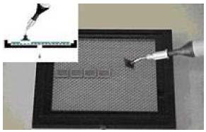 在臨時“釋放模式”(圖2)中,通過在托盤底部的一個孔中施加真空,使膠膜與目數的形狀相符,從而使表面接觸最小化。這減少了膠和設備之間的吸附力(更少的接觸點),允許使用真空提取工具時輕松地移除設備。