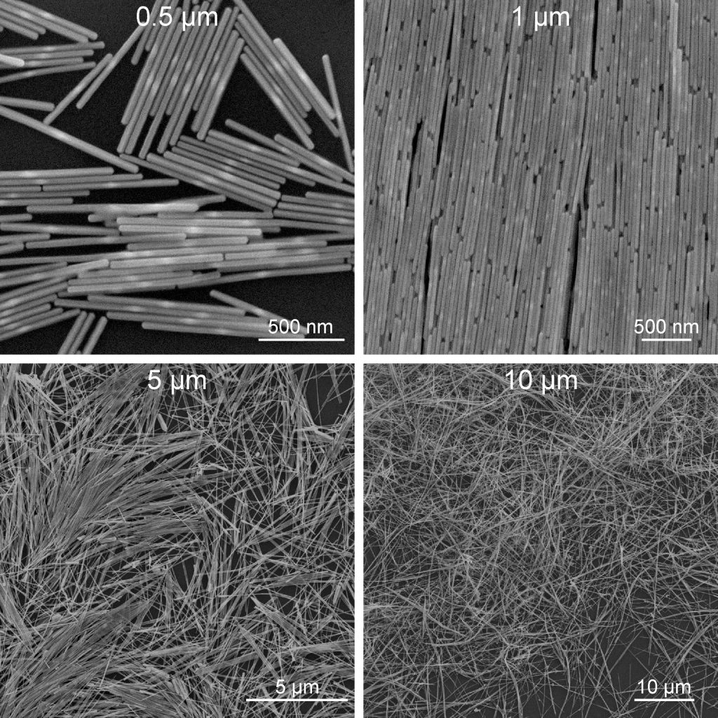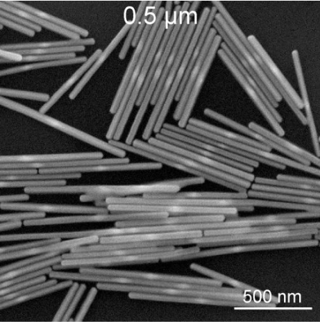 長銀納米棒是由金納米雙錐生長而成的,目前提供4種長度:~0.5微米、~1微米、~5微米、~10微米,它們的直徑介于~40納米至~70納米之間。這些長銀棒保存在~0.01 M CTAC (cetyltrimethylammonium chloride,一種表面活性劑)中,它們基本不含其它的顆粒雜質。這些長銀棒在嚴格控制的條件下合成,每一批樣品都會利用電子顯微鏡進行嚴格地檢查。