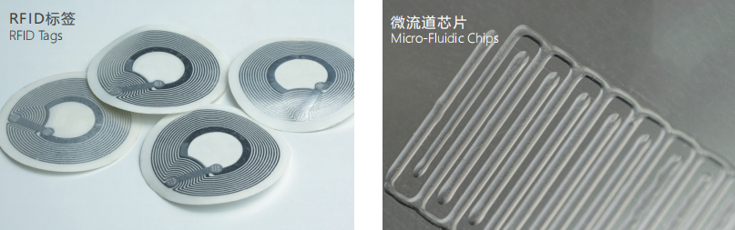 除此之外,借助我們提供種類豐富的印刷電子墨水,還可以實現RFID標簽,微流控芯片,柔性屏幕和多層PCB板等多種柔性電子器件的全印刷制備。