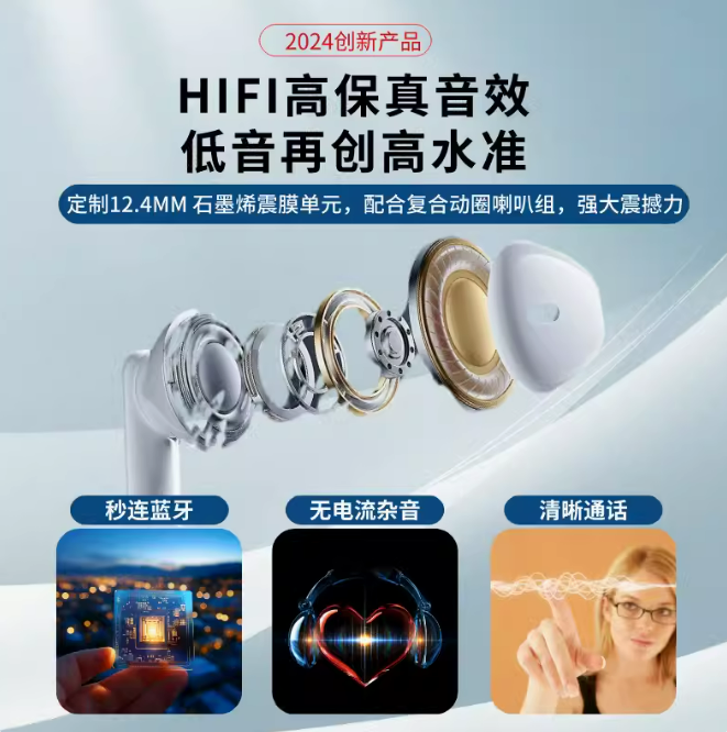 月照石墨烯基藍牙耳機是我司在國家石墨烯創新中心孵化產品。振膜采用石墨烯復合振膜,增加了振膜的強度,優化了耳機的高音部分的聽感。國家石墨烯創新中心于2022年11月獲工業和信息化部批復組建,是由浙江省石墨烯制造業創新中心升級組建的石墨烯領域國家制造業創新中心。