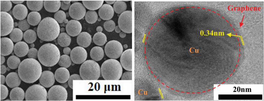 石墨烯/銅復(fù)合粉末具有獨(dú)特的石墨烯包覆球形銅粉的核殼結(jié)構(gòu),石墨烯與銅的 復(fù)合充分發(fā)揮了兩者的力學(xué)、電學(xué)及熱學(xué)的協(xié)同優(yōu)勢。