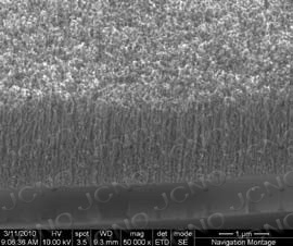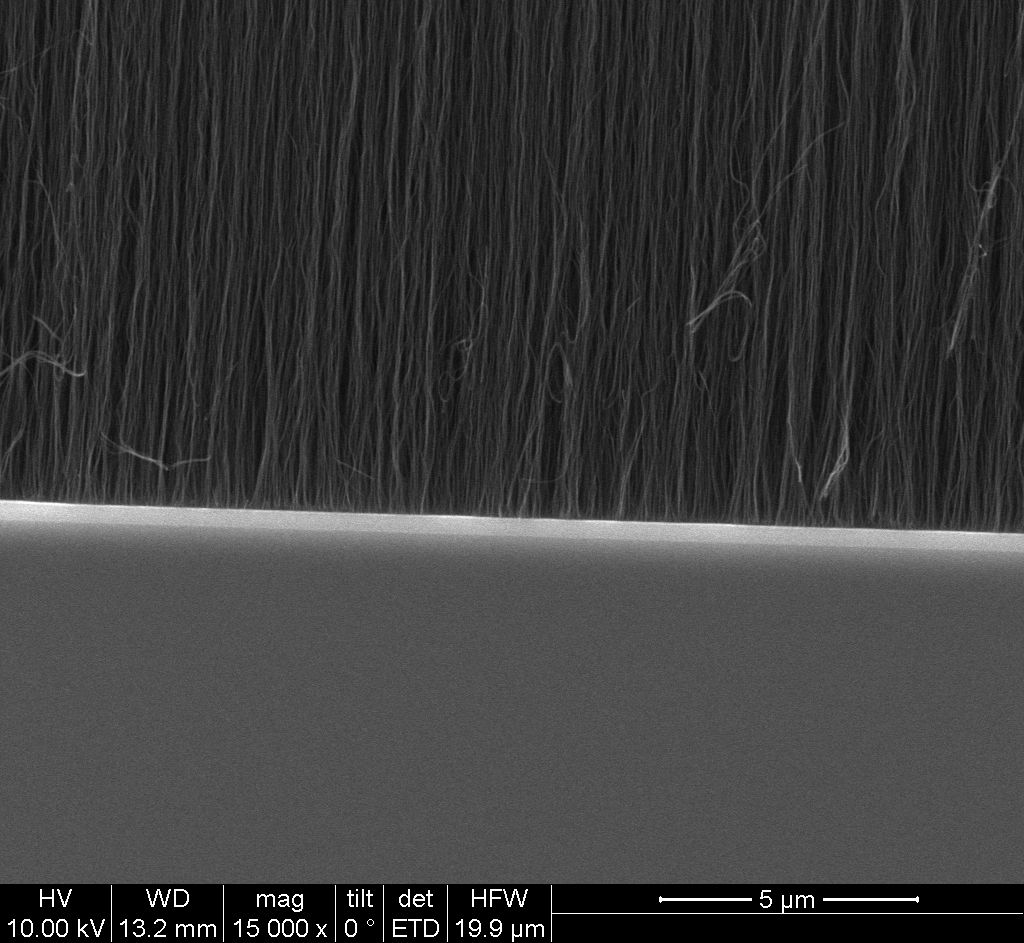 碳納米管陣列由于其獨(dú)特的宏觀組裝結(jié)構(gòu)呈現(xiàn)出許多獨(dú)特的物理和化學(xué)性能,在場發(fā)射器件、傳感器、電池以及電容器電極材料、熱界面材料以及復(fù)合材料等功能器件制備方面具有廣泛的應(yīng)用前景。吉倉納米的碳納米管陣列(JCNT-ARRAY)產(chǎn)品結(jié)構(gòu)高度可控,可以根據(jù)客戶需要生產(chǎn)各種面積尺寸、各種形狀并高度均勻的碳納米管陣列,而且可以在硅片基底、石英基底以及導(dǎo)電基底上制備碳納米管陣列產(chǎn)品。